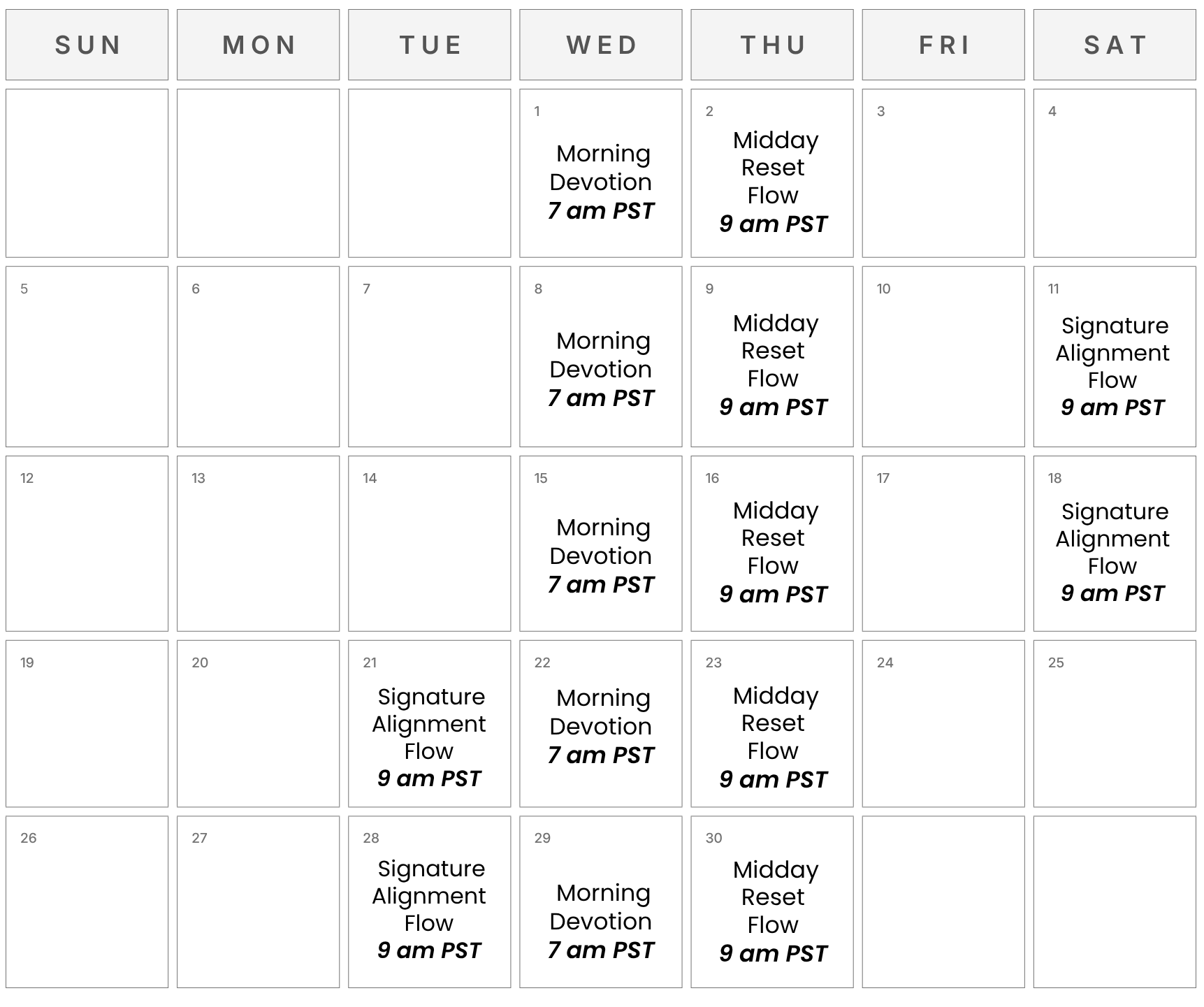 30-minute midday practice to shift the energy of the body, release tension, and steady the nervous system. Realign your body and reset your mindset. You’ll return to your day clear and refreshed.